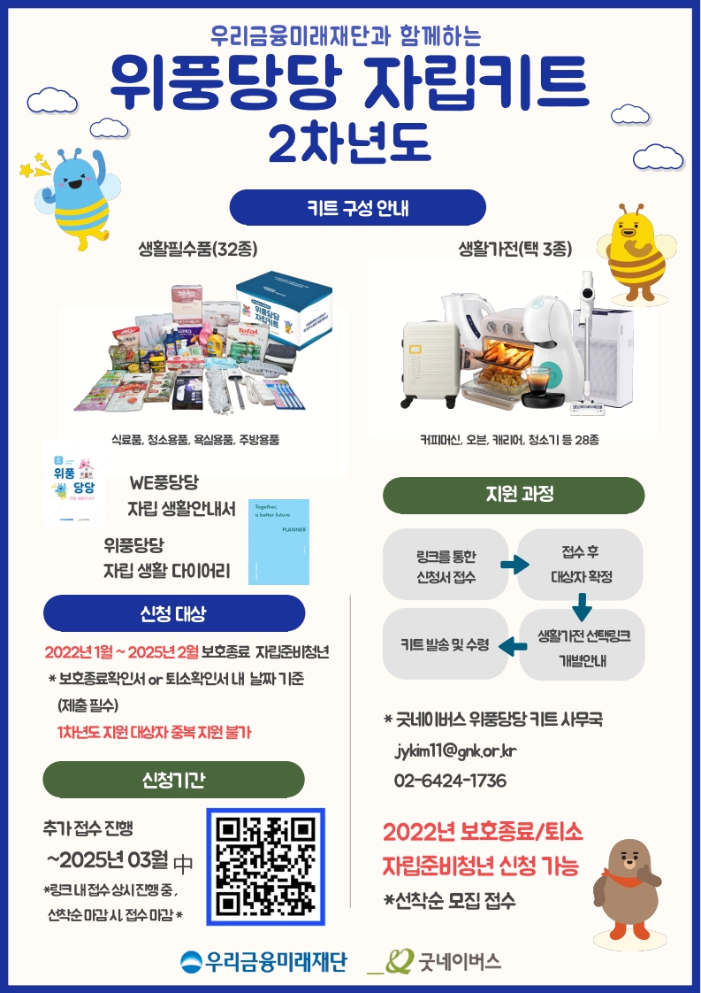 우리금융미래재단과 굿네이버스가 함께하는 자립준비청년 키트지원사업 "위풍당당키트"(2차년도) 대상자를 모집합니다(추가 접수 진행 중)