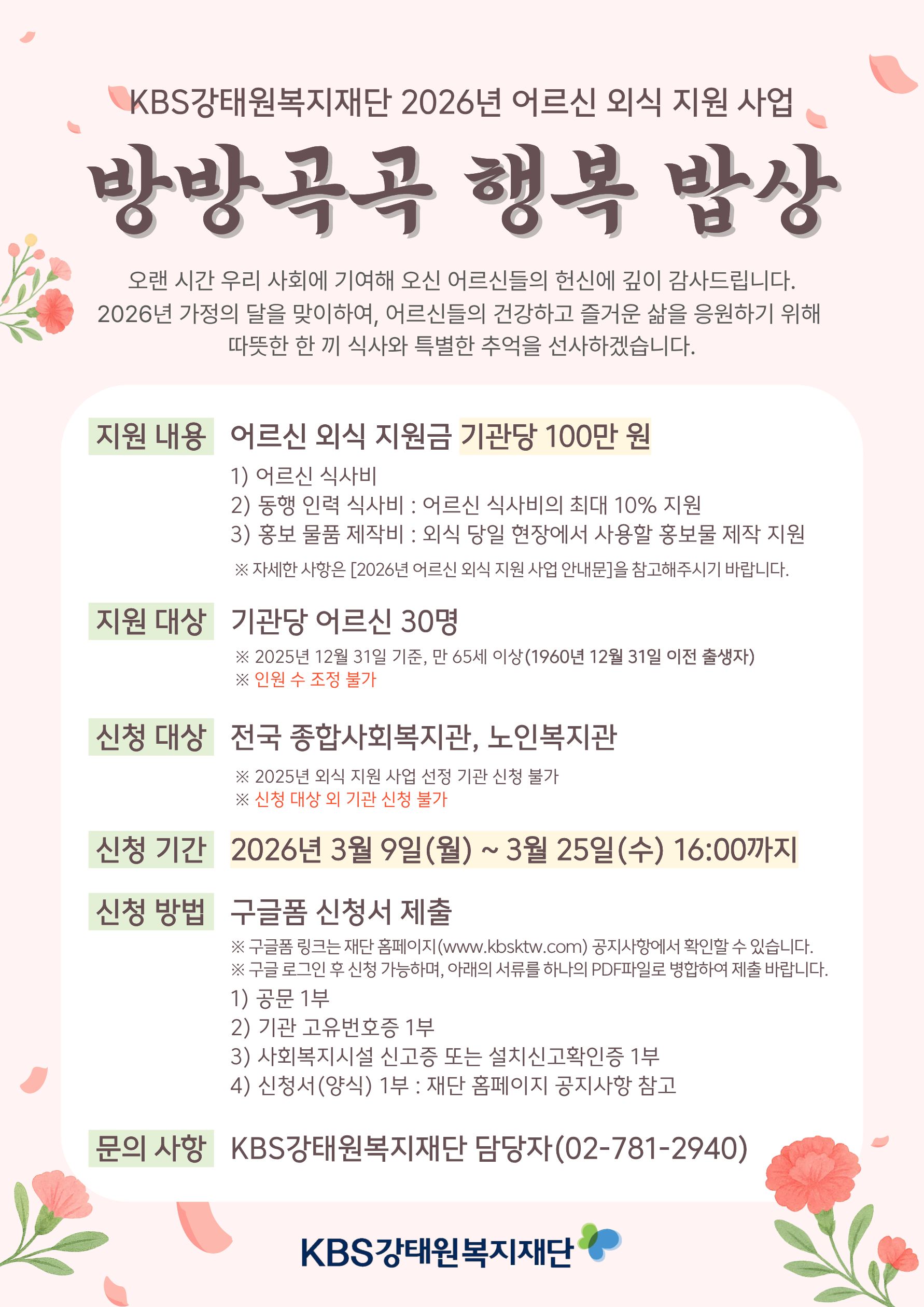 사회공헌공모 [KBS강태원복지재단] 2026년 어르신 외식 지원 사업 <방방곡곡 행복 밥상> 신청 안내