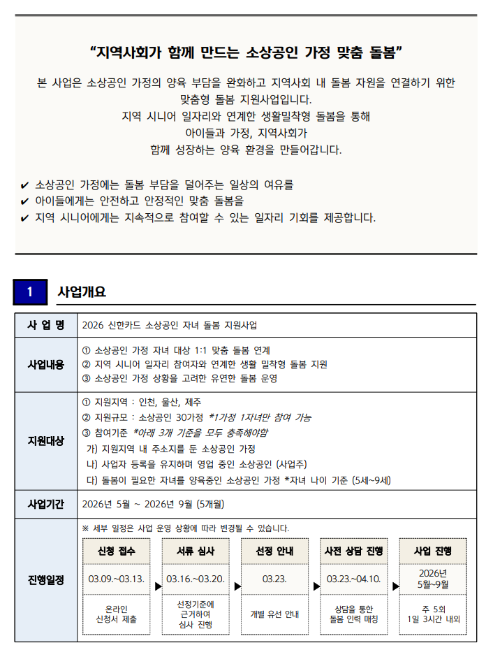 사회공헌공모 [아이들과미래재단] 2026 신한카드 소상공인 자녀 돌봄 지원사업 참여자 모집 공고 (~3/13)