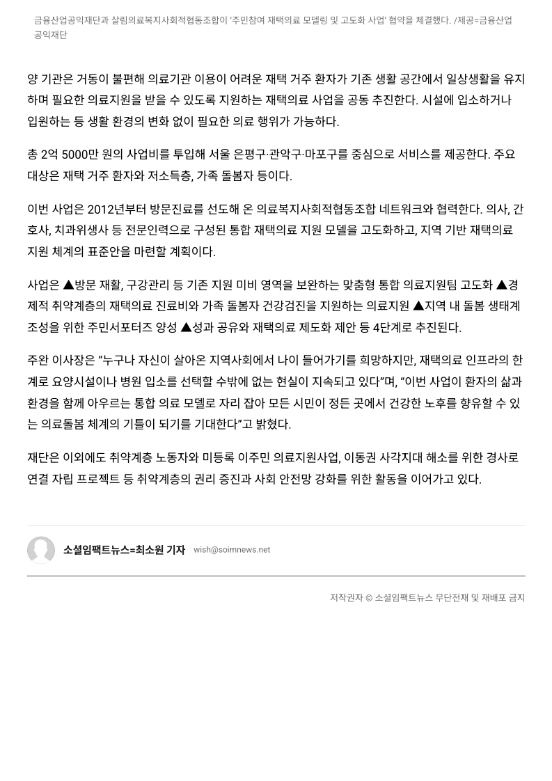 사회공헌기사 금융산업공익재단-살림의료복지사회적협동조합, 거동 불편 환자 위한 ‘주민참여형 재택의료 모델’ 구축 추진