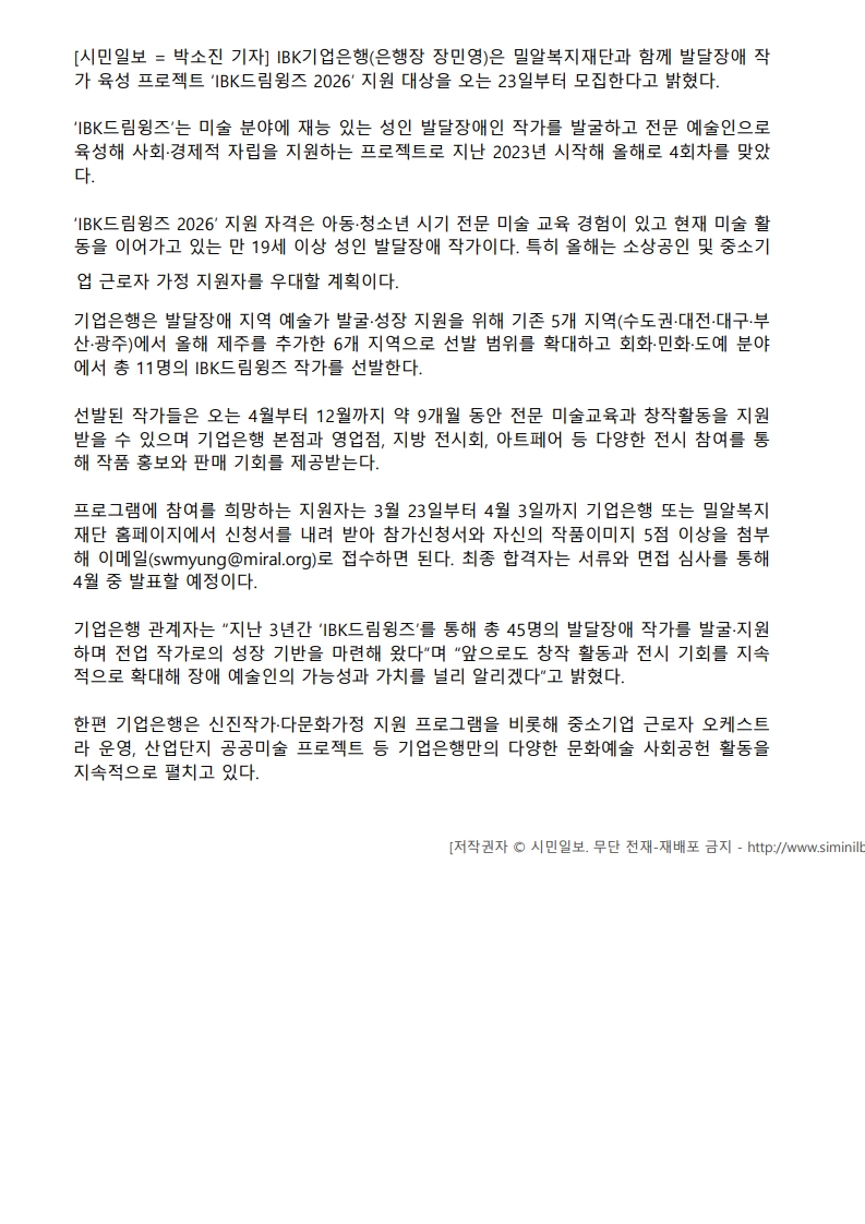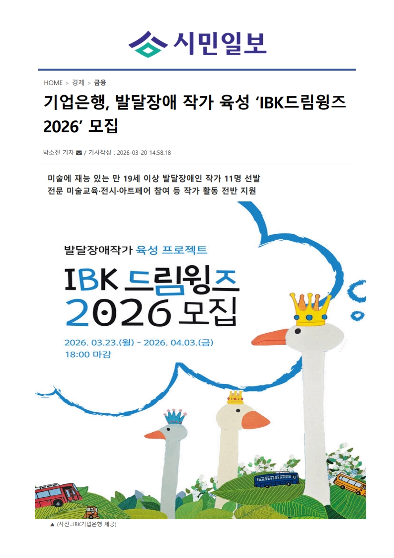 사회공헌기사 기업은행, 발달장애 작가 육성 ‘IBK드림윙즈 2026’ 모집
