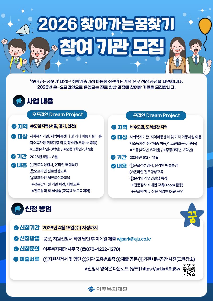 사회공헌공모 [아주복지재단] 2026 찾아가는꿈찾기 사업 참여 기관 모집 안내(~4/15)