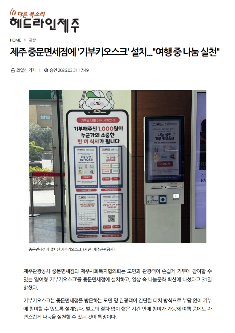 사회공헌기사 제주 중문면세점에 '기부키오스크' 설치..."여행 중 나눔 실천"
