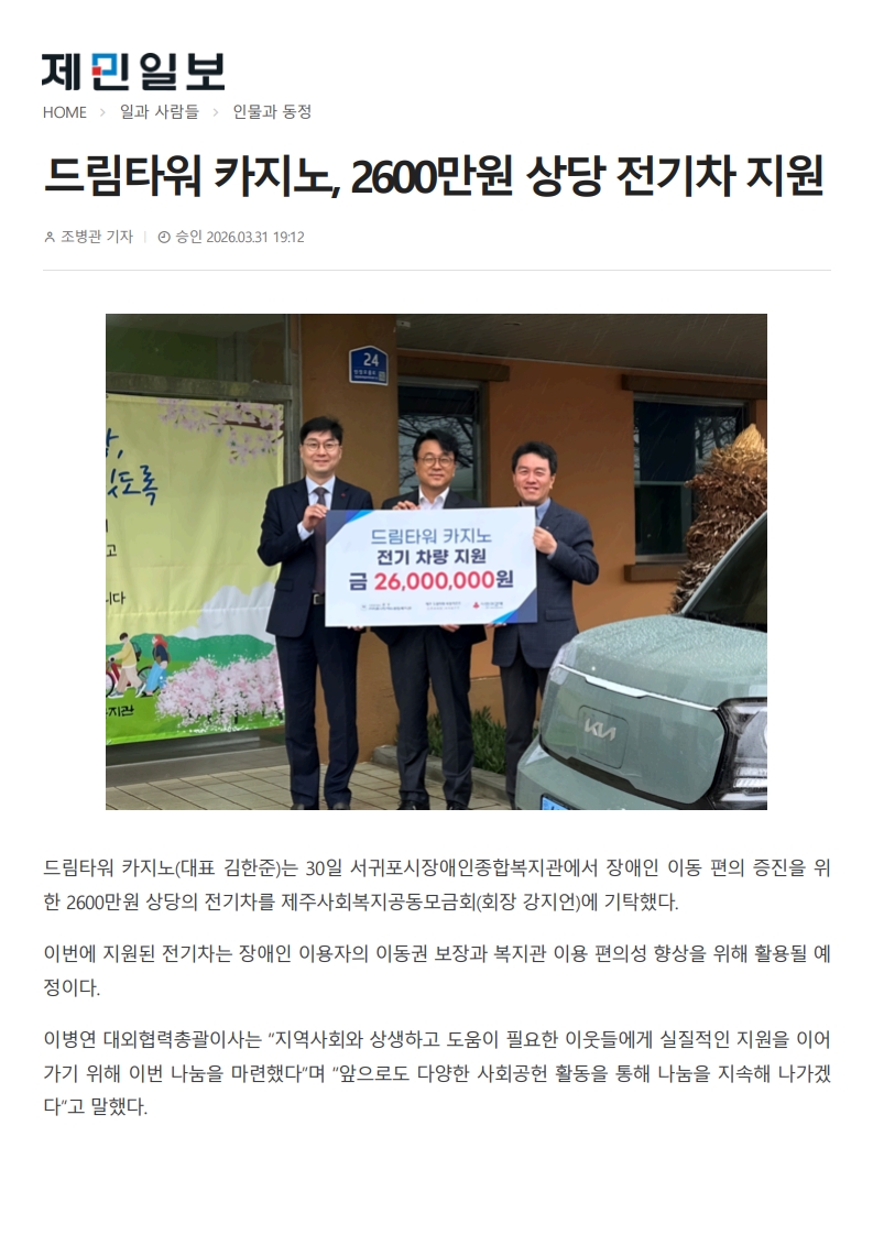 사회공헌기사 드림타워 카지노, 2600만원 상당 전기차 지원